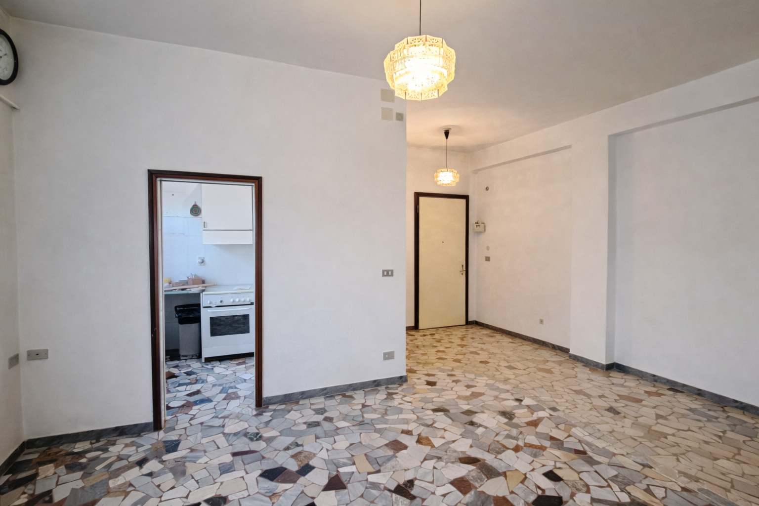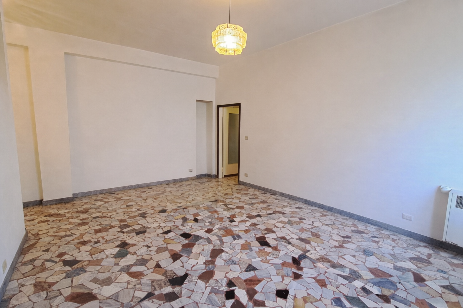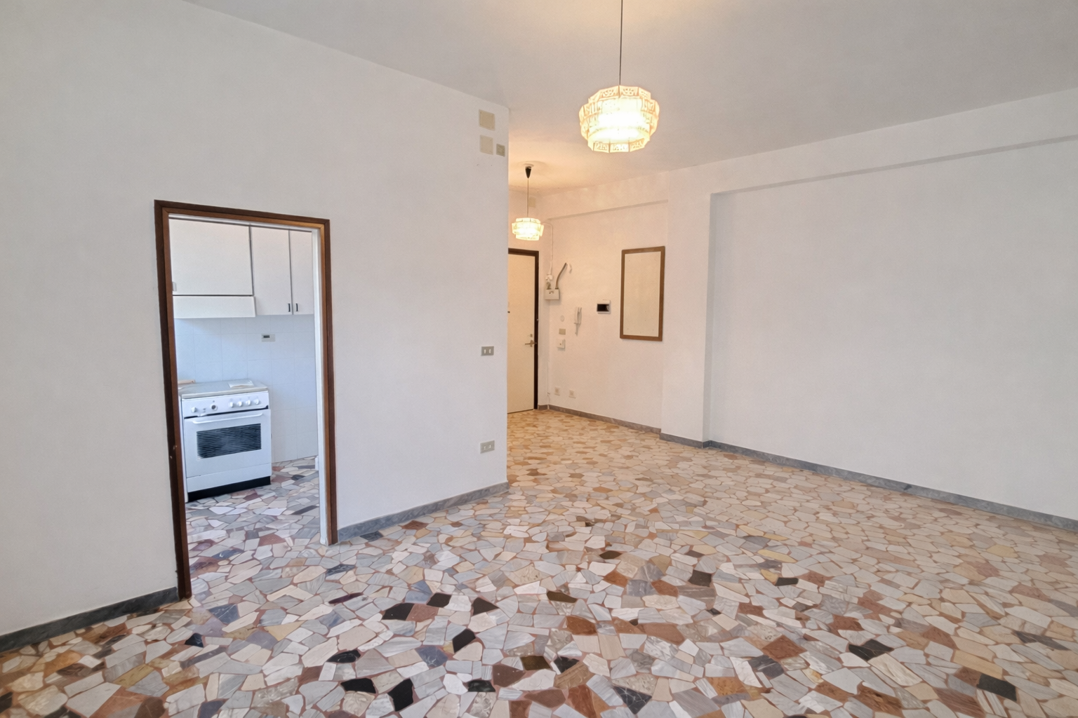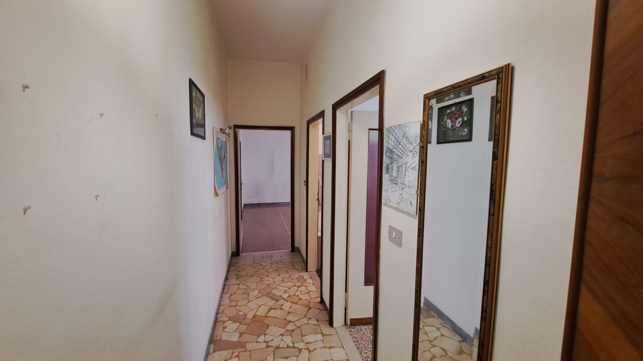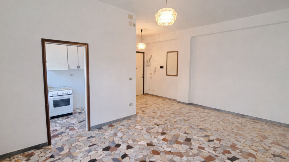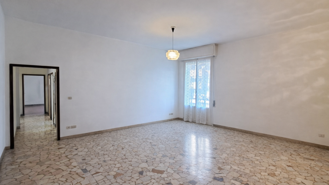 L’assenza di muri portanti consente una diversa distribuzione interna degli ambienti, con la possibilità di realizzare una spaziosa zona living con cucina a vista di oltre 30 mq calpestabili, mantenendo due ampie camere matrimoniali e un comodo bagno finestrato.